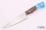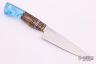 This 5" Culinary Utility knife by Edward R. Knives features a hand rub satin finished blade with .109" blade stock and 1.284" blade depth, very nice distal taper, hidden tang construction. The handle has a maple burl and resin grip. New from maker.