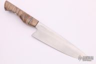 This 8" Chef's Knife by Edward R. Knives features a hand rub satin finished blade with .108" blade stock and 2.032" blade depth, very nice distal taper, hidden tang construction. The handle has a maple burl and resin grip. New from maker.