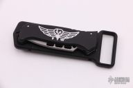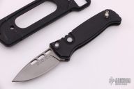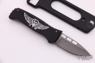 This Belt Buckle by Rob Dalton is made from black aluminum. Attached is a Micro Militia marked FTW. You can remove it by pulling out the butt of the knife first, then spin it and the front will come out. Bead blasted spear point blade with a black aluminum handle. Has some marks on the buckle, otherwise excellent condition.