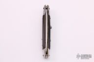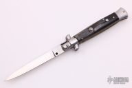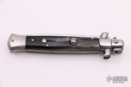 This swivel bolster auto stamped "B Rostfrei" features a polished blade. The handle has stainless steel bolsters and butt, buffalo horn scales and brass liners. Strong opening. Has safety. Has some scratches, otherwise good condition.