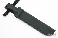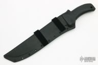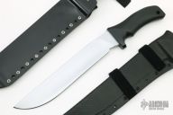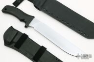 This Kodiak by MadDog Knives features a clip point blade. .252" stock. 1.644" blade depth. Selectively tempered, the knife has a Rockwell C-scale hardness of 62 at the edge (as hard as a file), and HRC 50-54 throughout the spine and hidden full tang. Hard chrome blade finish. With "Mad Dog" on the blade. The handle is designed to be ergonomic and has the ability to withstand tremendous punishment with little or no damage. It is hard and tough enough to be used as an impact tool. Includes a right and a left handed Combat sheath and an additional kydex sheath with velcro loops (3 sheaths). Has some light sheath marks on the blade, otherwise excellent condition. Comes with a zippered case.