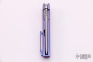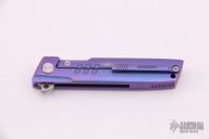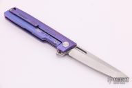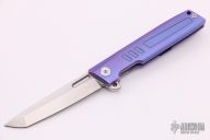 This D Rocket Squared Shark by Darriel Caston features a blasted tanto blade with notched thumbrest and flipper. The handle has a milled and anodized titanium frame with matching tip up clip and backspacer, stainless lockbar insert and over travel stop. Rides on bearings, nice detent, lockup and blade seating. Has some light scratches, otherwise excellent condition. Comes with original box.