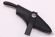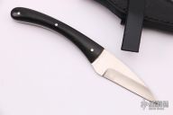 This Patch knife by GW Stone features a satin finished wharncliffe blade, .097" blade stock and .874" blade depth, full tang construction. The handle has black linen micarta scales. Comes with black leather sheath. Excellent condition.