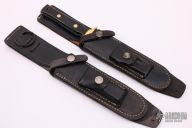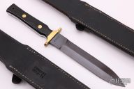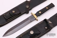 This dagger by Angus Arbuckle features a gun blued double-edged blade with .194" blade stock and 1.147" blade depth, full tang construction. The handle has a brass guard (which is a touch off center), black paper micarta scales and brass pins and lanyard hole. Comes with two black leather sheaths. Has some light scratches and patina, otherwise excellent condition.