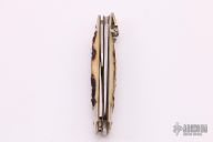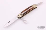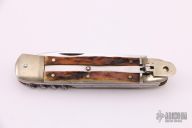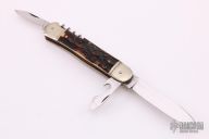 This Stag Multiblade Leverlock has a mirror polished stainless steel drop/ spear point blade with nail nick, a mirror polished stainless steel clip point blade with nail nick, a mirror polished bottle opener/ flat head screwdriver, and a corkscrew. Scales are stag antler over brass liners, stainless steel back spacer(s), and nickel silver bolsters. Has some light scratches and minor patina, otherwise excellent condition.