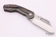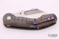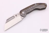 This UXC Framelock from DSK Tactical Knives features a satin wharncliffe blade with notched thumbrest and single thumbstud. The handle is constructed of milled, flamed and tumbled titanium frame, mokuti tip up clip. Blade is centered when closed, nice detent and lockup. Comes with COA. Has some scratches on the clip, otherwise excellent condition.
