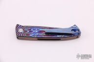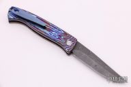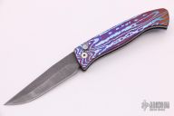 This Brend Auto #2 by Pro-Tech Knives features a Chad Nichols "Basket Weave" Damascus clip point blade with false top edge. The handle is comprised of a MokuTi frame with engraved push button, tip up milled and anodized titanium clip. Lanyard hole in pommel. Has some scratches, otherwise good condition. Comes with a zippered case.
