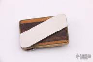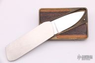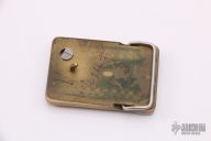 This Touché Belt Buckle Knife by Gerber features walnut inserts on a brass buckle the features a knife with stainless steel handle. Has scuffs and scratches, otherwise good condition.