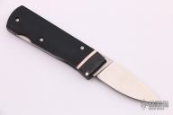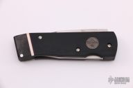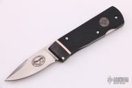 This Diamondback from Benchmark features a satin finish blade with swedge and notched thumbrest. The handle has a stainless steel frame with black linen micarta scales. Opening mechanism pushes blade up and out the front, then locks. Comes with original box, papers and nylon sheath. Excellent condition.
