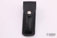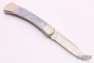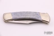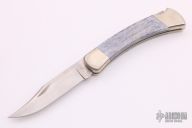 This Model 110 features a satin finished clip point blade with nail nick. The handle has a nickel silver frame with dyed bone scales and stainless steel spring. Comes with original box, papers and sheath. Excellent condition.