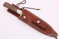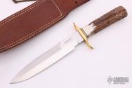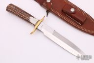 This Solingen Fighter by Randall Made Knives features a satin finished double-edged blade, .215" blade stock and 1.268" blade depth, hidden tang construction. The handle has a nickel silver guard and stag grip with black/brass spacers. Comes with a brown leather sheath. Excellent condition. Hard to find.
