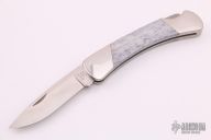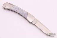 This knife has a satin finished clip point blade with nail nick. The handle has a steel frame, bolsters, gray bone scales and a stainless steel spring. Comes with original box and COA. Excellent condition.