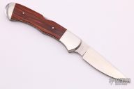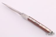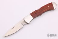 This Buck 532 features a satin finished blade with nail nick. The handle has a fileworked stainless steel frame and bolsters with wood inlays and stainless steel spring. Comes with original box, papers and brown leather sheath.  Excellent Condition.