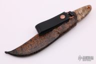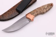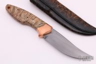 This Hunter by Anders Hogstrom features a carbon steel blade with hamon, .245" blade stock and 1.277" blade depth, hidden tang construction. The handle has a textured copper guard and a chestnut burl grip with copper pin and lanyard hole. The sheath is brown/tan leather in Nordic style. New from maker. Truly Stunning. Comes with a Velcro case.