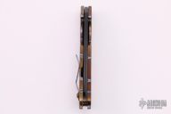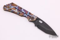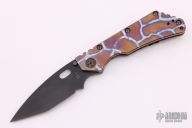 This DDC Ti SMF by Duane Dwyer features a black tanto chisel ground blade with thumbhole. The handle has a flame finished titanium frame with matching tip up titanium clip, anodized titanium hardware. Nice detent, lockup and blade seating. New from maker. Comes with a zippered case.