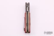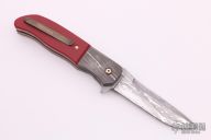 This knife by Bob Terzuola is called "Cable Car 415". It features a spear point blade with false top edge, notched thumbrest and flipper. The blade and bolsters were made by Chad Nichols from cable salvaged from the San Francisco Cable Cars in 1984. The handle has Damascus bolsters, red G-10 scales with satin and anodized finished titanium backing, bead blasted and anodized titanium liners, anodized titanium backspacer, and a tip up anodized and bead blasted titanium clip. The front scale has an etched titanium cartouche inlay with a picture of a San Francisco Cable Car. Nice detent, lockup and blade seating. Has a stainless steel lockbar insert. 18kt gold screws. Comes with nylon zippered case. New from maker from the 2016 Solvang Knife Show.