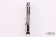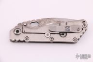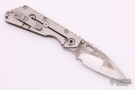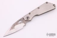 This SMF by Mick Strider features a nightmare ground blade with a notched thumbrest and thumbhole and magma textured flats. The handle has an orange peel finished titanium frame with matching tip up clip. Comes with velcro case. New from maker.