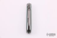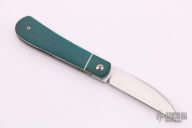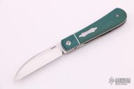 This Swayback Front Flipper by Enrique Pena features a hand rub satin finished wharncliffe blade with swedge, notched thumbrest and front flipper. The handle has a emerald green canvas micarta bolsters and scales with white G-10 liners, titanium liners, matching micarta backspacer with white liners. Includes padded and zippered case. Excellent condition.