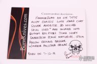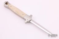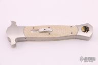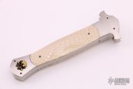 This Custom Hammer Head OTF by Burn Knives features a mirror polished double-edged blade. The handle has an aluminum frame with Juma ivory snakeskin scales. Has 3d milled skull logos in rear bolsters. Nice action and lockup. Has some light scratches, otherwise excellent condition. Comes with COA dated 7-12-19.