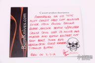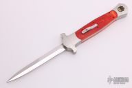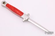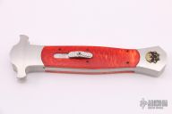This Custom Hammer Head OTF by Burn Knives features a mirror polished double-edged blade. The handle has an aluminum frame with Juma red snakeskin scales. Has 3d milled skull logos in rear bolsters. Nice action and lockup. Has some light scratches, otherwise excellent condition. Comes with COA dated 8-7-19.
