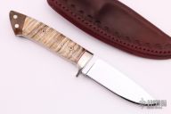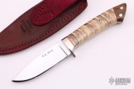 This Hunter by Phillip M Parris features a mirror polished blade with .185" blade stock and 1.079" blade depth, full tapered tang construction. The handle has a nickel silver guard, mammoth tooth scales with red liners and mosaic pins, Amboyna Burl rear bolsters. Comes with a hand tooled maroon leather sheath. New from maker.