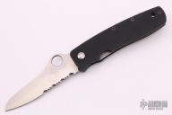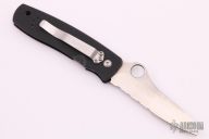 This Bob Terzuola designed knife from Spyderco has a satin finish partially serrated edge blade and black aluminum scales. Clip is interchangeable to up or down positions according to user preference. Comes with original box. Excellent condition.