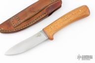 This Semi-Skinner by Paul Cooper features a satin finished blade with .129" blade stock and .882" blade depth, mortise tang construction. The handle has osages orange grip with brass pins. Comes with a brown leather sheath. New from maker.