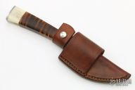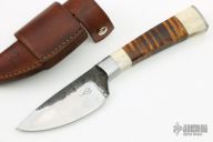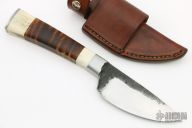 This Skinner/Utility by Paul Cooper features a hand forged satin finished blade with integral bolster with forged scale still present, .228" blade stock and .330" blade depth, hidden tang construction. The handle has a curly maple grip with elk horn spacers and a steel butt plate Comes with a brown leather sheath with belt loop. New from maker.