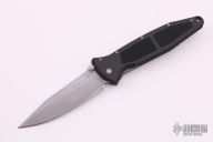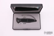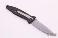 This manual Socom liner lock folder by Microtech features a silver coated plain edged blade with dual thumbstuds and notched thumbrest. The handle has a black aluminum frame with rubber inlays. Dated 10/98. Original box, sheath and papers. Has a few scuffs, looks to have been resharpened, otherwise good condition.