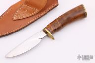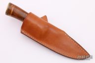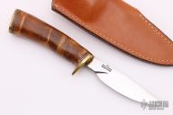 This Bird and Trout by Irvin Campbell features a drop point blade with visible temper line, .147" blade stock and .922" blade depth, hidden tang construction. The handle has a brass guard and butt with wood handle with black and white spacers. Comes with a brown leather sheath. Has some light pitting on the blade and some light scratches, otherwise good condition.
