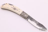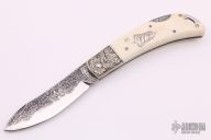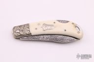 This lockback folder by Heinrich Henry Frank features a mirror polished blade with nail nick and engraving on both sides. The handle has engraved nickel silver bolsters, walrus ivory covers, nickel silver escutcheons, one engraved with "JDB" and the other with flower engraving, nickel silver pins, engraved lock release on sides and on spine, nickel silver liners, polished steel backspacer with lanyard hole, copper blade stop inside handle. Dated Feb 1972. Nice lockup and blade seating. Has a few very light scratches, otherwise excellent condition. Very well done piece. Comes with zippered case.