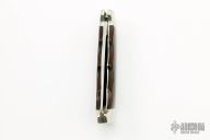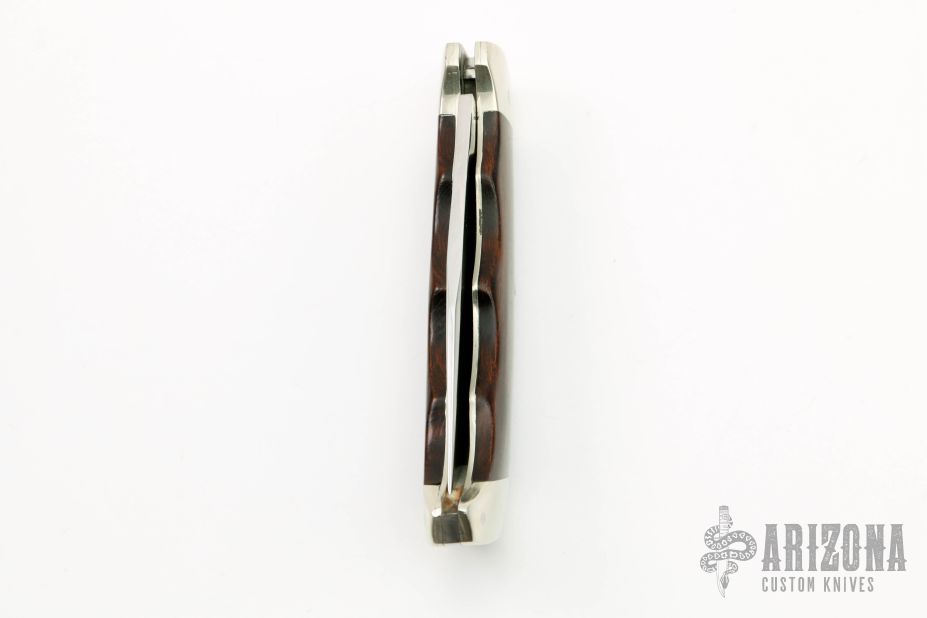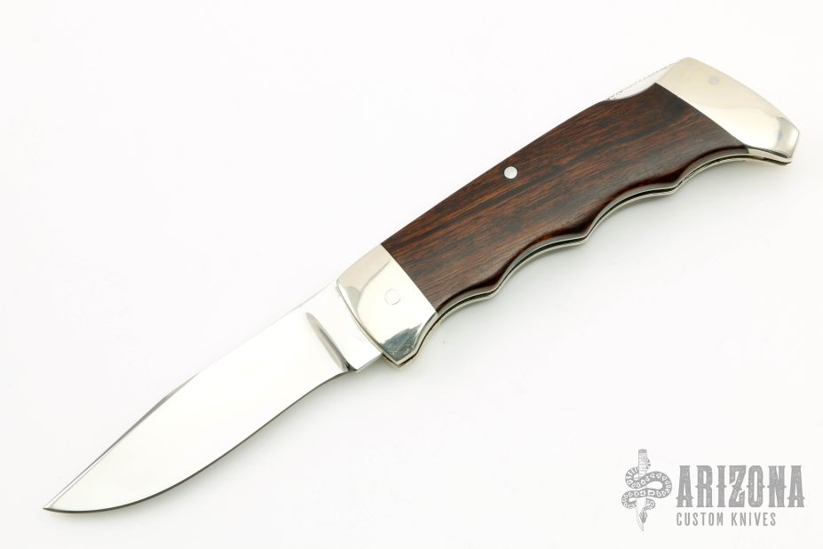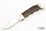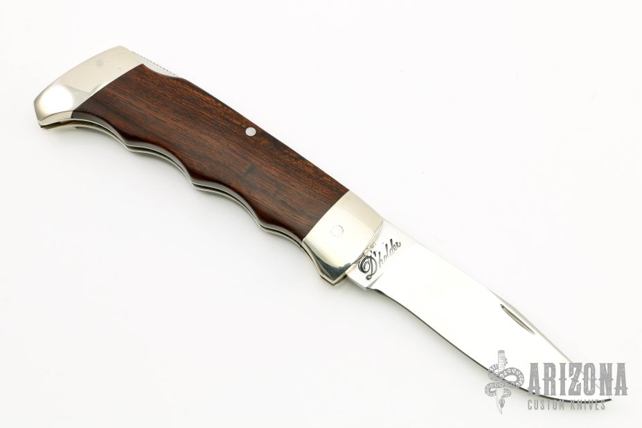 This Lockback by D'Alton Holder features a mirror polished blade with nail nick. The handle has nickel silver bolsters and liners, ironwood scales and a stainless steel backspacer with notched lock release. Comes with a hand tooled brown leather sheath. Has a couple light scratches, otherwise excellent condition.
