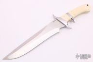 This Sub-Hilt Fighter by Jim Siska features a hand rub satin finished double-edged recurve blade, .250" blade stock and 1.860" blade depth, full tapered tang construction. The handle has walrus ivory scales with a polished stainless steel guard and sub-hilt. Comes with a brown leather sheath. Has a few light scratches and the ivory has shrunken slightly, otherwise excellent condition.