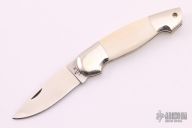 This Gent's Folder from Lile Knives features a 2" satin finish blade with nail nick, nickel silver dovetailed double bolsters with integral liners, mammoth ivory scales. Has a few light scratches, otherwise excellent condition. This knife has the dot above the "I" meaning it was made after Jimmy's death.