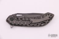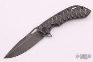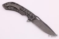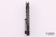 This Wayfarer 247 from Olamic Cutlery features a black tumble finished spear point blade, thumbhole, notched thumbrest and flipper. The black tumbled and sculpted titanium frame titanium pocket clip is positioned for tip up carry with a ceramic ball inlay, floating and sculpted titanium backspacer. The Wayfarer 247 is very comfortable in the hand and flips well with no wrist action needed. Blade is centered when closed and locks up with no play. Has some scratches and has been resharpened, otherwise good user condition. T594
