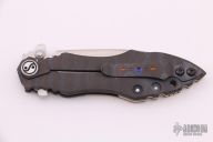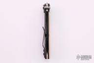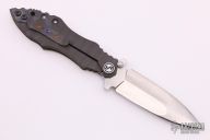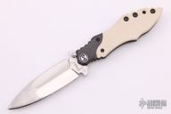 This custom frame lock flipper by Yuna Knives features a satin finish double ground blade with a partially sharpened top edge. Carbon fiber bolster, ivory paper micarta scale on front of handle and bead blast and flamed titanium reverse side and pocket clip. Does require wrist action when flipping, strong lock up, soft detent. Has some scratches, has been sharpened, otherwise good condition.