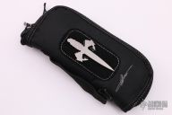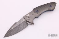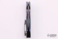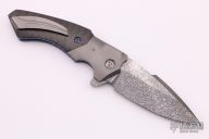 This White Swan Flipper from Allen Elishewitz features a black snow finished drop point 204P blade with swedge and flipper. The handle is comprised of bead blasted titanium bolsters, C300 carbon fiber scales, textured and anodized titanium liners with jeweled interiors, black G-10 backspacer, bead blasted titanium tip up pocket clip with hidden screws, anodized titanium screws in handle. Includes padded velcro case and "Elishewitz Custom Knives" patch. Excellent condition.