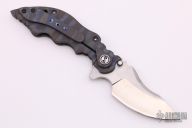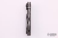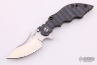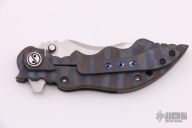 This Hard-1 frame lock flipper by Yuna Knives features a "Flame" finished and bead blasted titanium frame and tip up clip, flamed titanium overtravel stop and backspacer. Satin finished blade with dual thumb studs and a notched thumbrest and flipper. Rides on bearings, nice detent, blade seating and lockup. Comes with a leather case and a COA dated Feb 10, 2020. Excellent Condition.