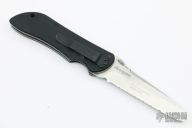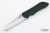 This Rescue Stryker by Benchmade features a stonewashed fully serrated blade with thumbdisc and notched thumbrest. The handle has black G-10 scales, titanium liners and a black stainless steel tip down clip. Comes with original box and papers. Excellent condition.
