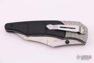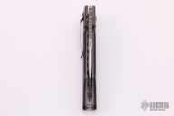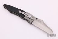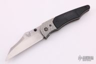 This Snody Design Gravitator by Benchmade features a tumbled wharncliffe style blade with dual thumb-studs and a notched thumbrest. The handle has silver twill bolsters and black G-10 scales, with bead blasted titanium liners and stainless steel posts. Has a stonewashed stainless steel clip, tip down carry. Nice detent, lockup and blade seating. Includes a Benchmade box and papers. Has some scratches, has been sharpened, very tip is blunted, otherwise good user condition.