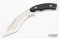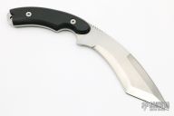 This custom knife by Robert Newton is a Laci Szabo design, it features a satin finished tanto double-edged blade with a notched thumbrest, .183" blade thickness and 1.860" blade depth, full tang construction. The handle has black wood scales. Great feel in the hand. Very nice work. Includes a zippered case. Has some scratches, otherwise excellent condition.