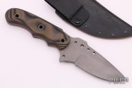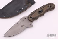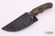 This Utility by Boekoe Knives features a bead blasted blade with notched thumbrest, .175" blade stock and 1.502" blade depth, full tang construction. The handle has black/green G-10 scales. Comes with a leather over kydex sheath and a zippered case. Excellent condition.