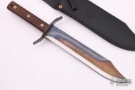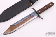 This Bowie features a clip point blade, .146" blade stock and 1.958" blade depth, full tang construction. The handle has a steel guard and wood scales. Comes with a black leather sheath and zippered case. Has some light scratches, otherwise excellent condition.