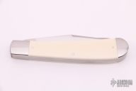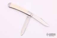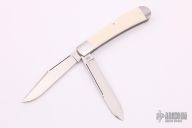 This 2-blade Trapper by Terry Davis features two hand rub satin finished blades with long pull nail nicks. The handle has mirror polished stainless steel bolsters, walrus ivory covers, stainless steel pins, liners and springs. Dated 1994. Has some light scratches and a couple of scratches, excellent condition otherwise.