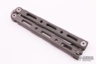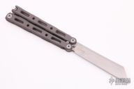 This Model 87 Balisong by Benchmade features a tumble finished wharncliffe style blade. The handle is comprised of an integrally constructed, skeletonized titanium frame with bead blast finish. Spring loaded T latch on pommel. Comes with original box and papers. Has scuffs on the handles, otherwise good condition.