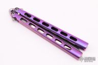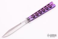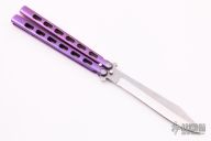 This Highroller by Mike Snody features a hand ground, satin finish clip point blade with swedge. The handles are integral billet titanium channel handles that were anodized. Very smooth flipping. Has some scratches, otherwise excellent condition. Includes original box.