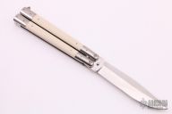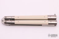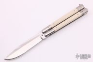 This Balisong by Pinoy Knives (Matt Cook) features a satin finished blade with false top edge. The handles are polished stainless steel with ivory paper micarta inlays, has a t-latch. Has a few light scratches, otherwise good condition. Comes with original wooden box.