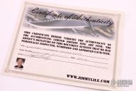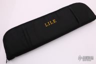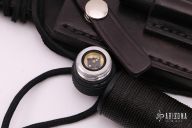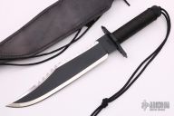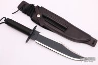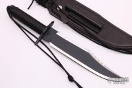 This Next Gen Rambo Mission knife features a two-tone blade with black center and mirror polished grinds, 14 saw-teeth on blade spine and sharpened top edge, .258" blade stock and 1.825" blade depth, hidden tang construction. The handle has a black stainless steel double guard with flat and Phillips head screwdrivers, hollow cord wrapped handle, and aluminum removable butt cap with a compass and an O-ring to make it water-proof. Comes with black leather sheath with a honing stone in the sheath, COA dated 7/2019 and a Lile zippered case. The blade is stamped 120. Designed by Jimmy Lile and made by Vaughn Neeley. Excellent condition.