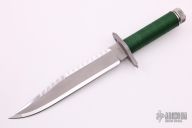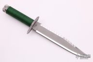 This Lile First Blood Knife by Vaughn Neeley is #101, it features a two-tone blade with bead blasted center and mirror polished grinds, sharpened top edge and 14 saw-teeth on blade spine, .259" blade stock and 1.449" blade depth, hidden tang construction. The handle has a bead blasted stainless steel double guard with flat and Phillips head screwdrivers, hollow cord wrapped handle, and aluminum removable butt cap with an O-ring to make it water-proof. Comes with brown leather sheath that has a honing stone pouch. Has compass in butt cap. The blade is stamped "101" Designed by Jimmy Lile and made by Vaughn Neeley. Excellent/new condition. Comes with zippered case.