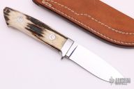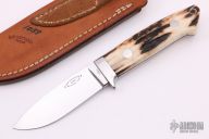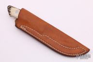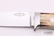 The classic Drop Point Hunter that made Bob Loveless designs so famous. Mirror finished drop point blade with the "R.W. Loveless maker Riverside, Calif." logo. Full tapered tang construction. .183" Blade Stock 1.049" Blade Depth. The handle has a nickle silver guard and stag scales with red liners, lanyard hole. #1039. Comes with matching numbered leather sheath. Has a few very light scratches, otherwise excellent condition. This knife has really nice stag which can be hard to find on a Loveless.